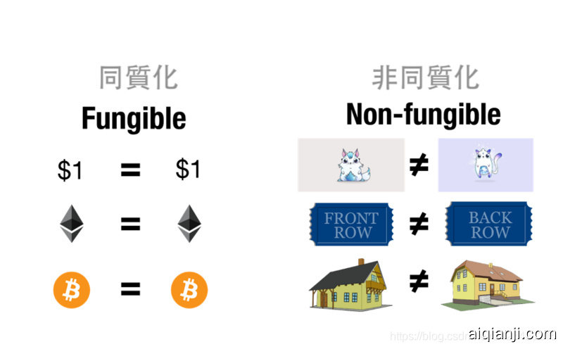 既然NFT被称作「非同质化代币」,那么相应的肯定有「同质化代币」,下图是二者一个形象的举例。