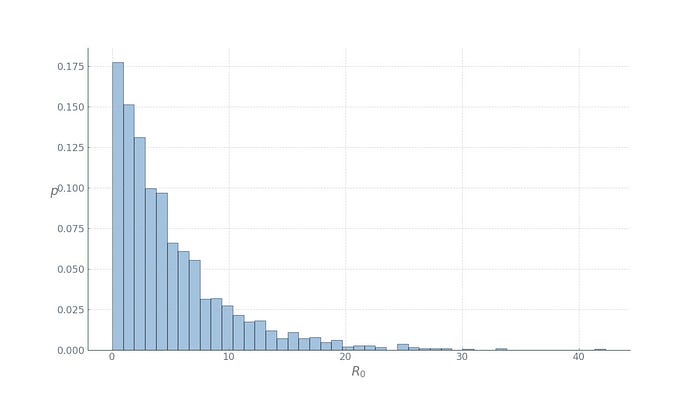 Further, to formalise how the disease is transmitted by an infected person, we need the basic reproduction number, R0. It is defined as R0 = βt / γ where γ is the recovery rate, and can be thought of as the expected number of secondary infections after an infected individual comes into contact with a susceptible population. At the time of this writing, the basic reproduction number for the Wuhan coronavirus has been estimated to be between 1.4 and 4. Let’s take the worst case and assume it’s 4. However, we should note that it’s actually a random variable and the reported number is but the expected number. To make things a bit more interesting, we will run our simulations with different R0 at each location, drawn from a good candidate distribution, Gamma, with mean 4: