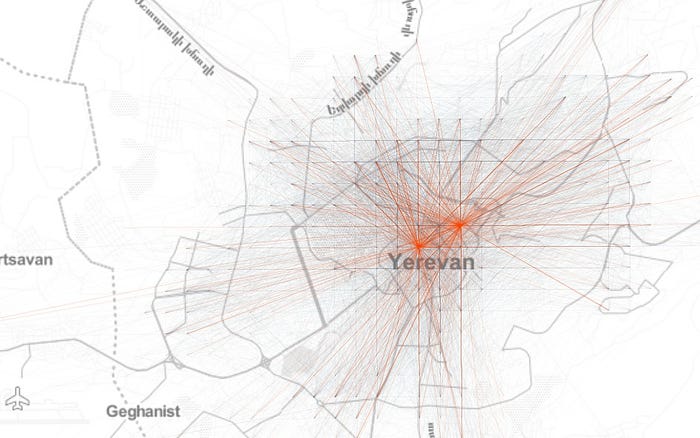 因此,让我们首先查看埃里温统一笛卡尔网格上的聚合起点-终点 ( OD ) 流动网络,以了解该城市流动模式的空间结构: