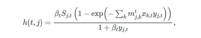 其中βt是第**t天的传输速率;mj,k反映从位置k到位置j的流动性,xk,t和yk,t分别表示第**t天在位置k和位置j的感染和易感人群的比例,由xk,t = Ik,t / Nk和yj,t = Sj,t / Nj,其中Nk和Nj是位置k和j的人口规模. 然后我们继续模拟将疾病引入具有完全易感人群的位置的随机过程,其中Ij,t+1是概率*为 h(t,j)*的伯努利随机变量。