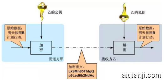 - 乙方再用自己保存的另一把专用密钥(私钥)对加密后的信息进行解密。乙方只能用其专用密钥(私钥)解密由对应的公钥加密后的信息。