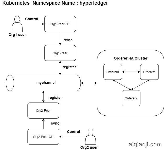 下图为本范例的部署架构,所有hyperledger 所需节点皆部署于 k8s 中的 hyperledger namespace 当中。架构中包含的节点如下