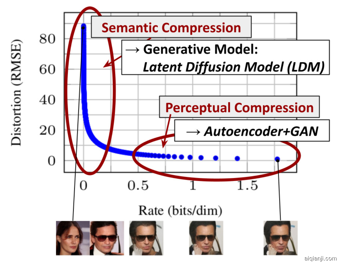 Fig. 8. The plot for tradeoff between compression rate and distortion, illustrating two-stage compressions - perceptural and semantic comparession. (Image source: Rombach & Blattmann, et al. 2022)The perceptual compression process relies on an autoencoder model. An encoder E is used to compress the input image x∈RH×W×3 to a smaller 2D latent vector z=E(x)∈Rh×w×c , where the downsampling rate f=H/h=W/w=2m,m∈N. Then an decoder D reconstructs the images from the latent vector, x~=D(z). The paper explored two types of regularization in autoencoder training to avoid arbitrarily high-variance in the latent spaces.