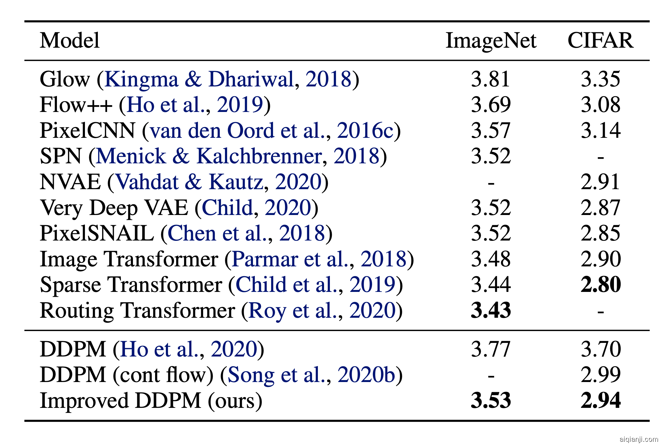 Fig. 6. Comparison of negative log-likelihood of improved DDPM with other likelihood-based generative models. NLL is reported in the unit of bits/dim. (Image source: Nichol & Dhariwal, 2021)# Speed up Diffusion Model Sampling