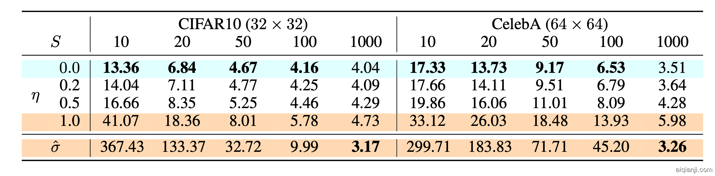 Fig. 7. FID scores on CIFAR10 and CelebA datasets by diffusion models of different settings, including DDIM (η=0) and DDPM (σ^). (Image source: Song et al., 2020)Compared to DDPM, DDIM is able to: