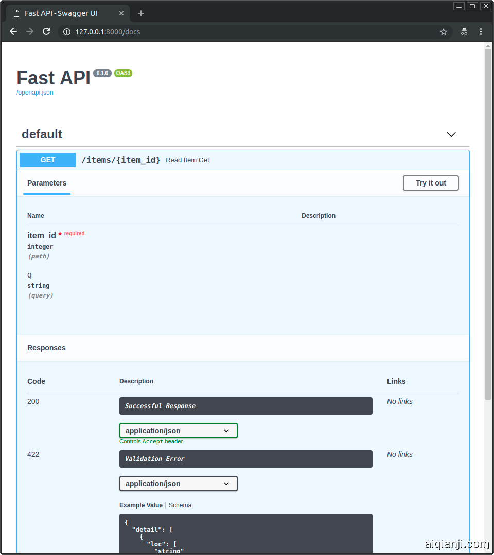 在服务器启动状态下,访问http://127.0.0.1:8000/docs 页面,你将会看到自动生成的交互式 API 文档,它使用Swagger UI形式。