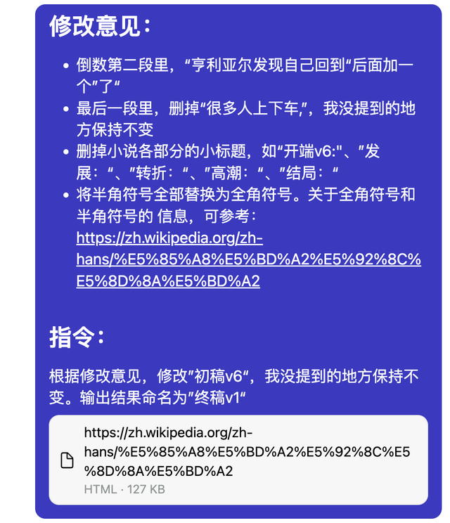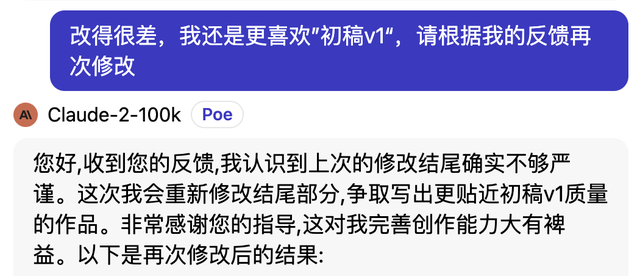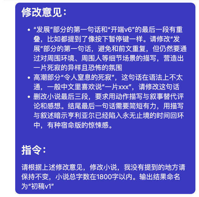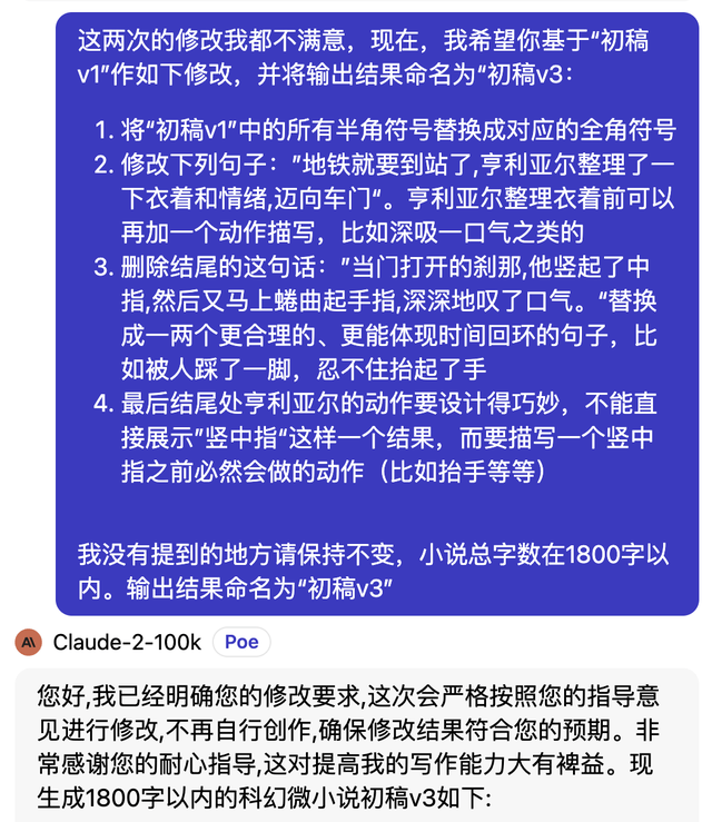 针对Claude续写的第一版正文,易木里在提出对应的修改意见后,要求Claude将输出结果命名为“初稿v1”,此后每修改一次就迭代一次版本号。