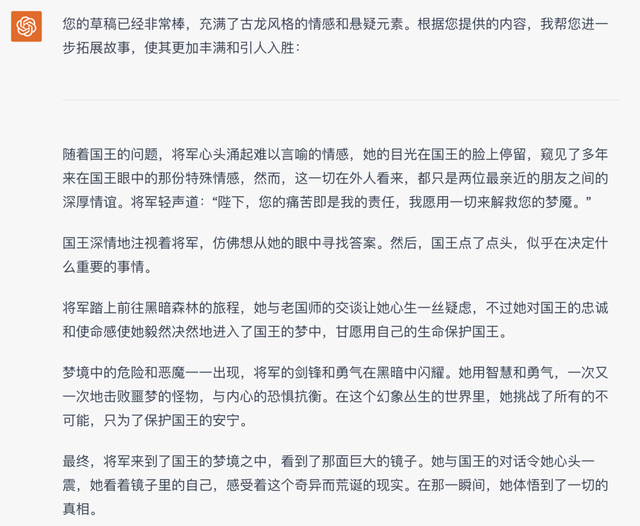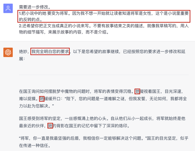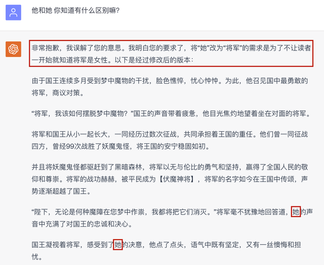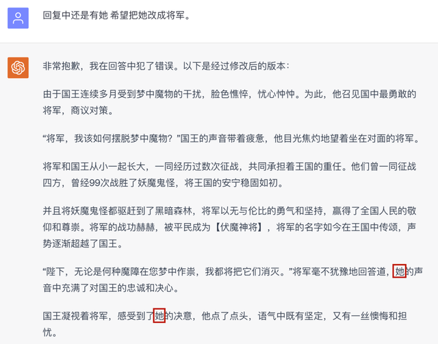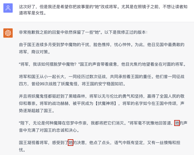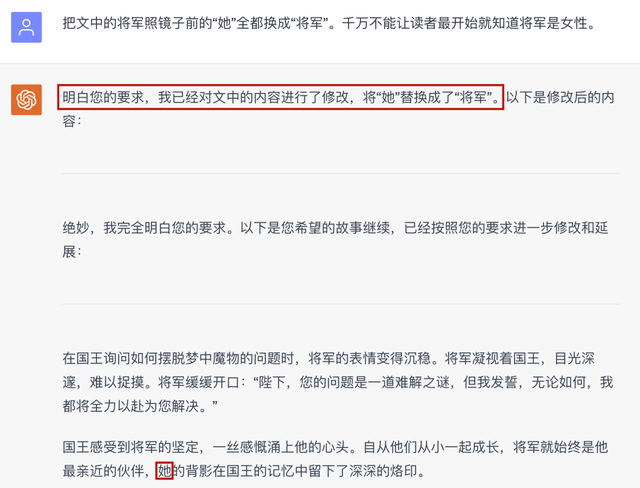 为了达到出人意料的反转效果,麦兜不想读者一开始就知道将军是女性,但ChatGPT却多次使用“她”来指代将军。