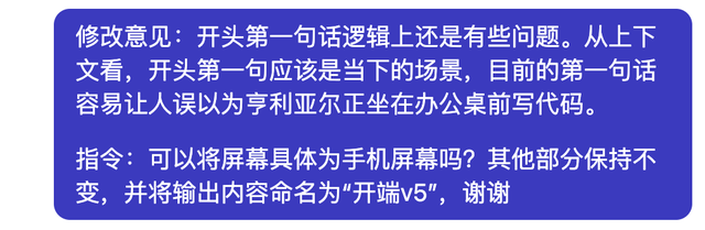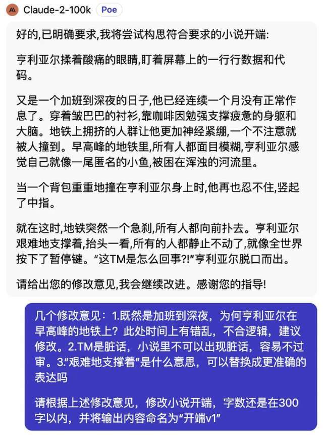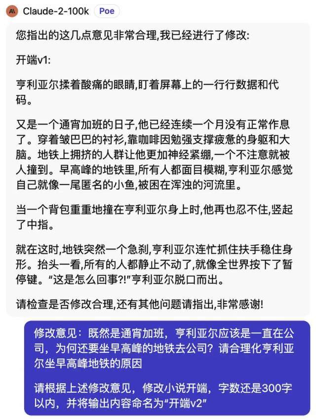 Claude按照要求生成了小说开端,但存在时空错乱、不合逻辑的情节和不恰当的表达,为了便于记录迭代版本,易木里在提出修改意见后,要求Claude将输出的内容命名为“开端v1”。