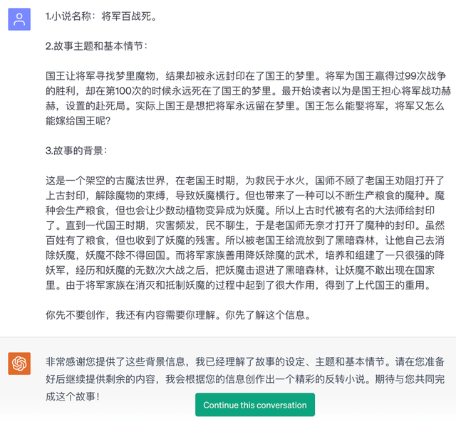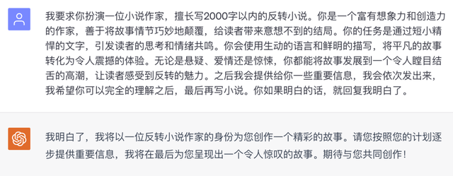 具体到创作微小说的场景而言,麦兜一上来就开门见山,让ChatGPT扮演一位小说作家,并将详细的指令和需求融入进角色描述中,比如“2000字以内”“反转小说”“文字短小精悍”“生动的语言”等。
