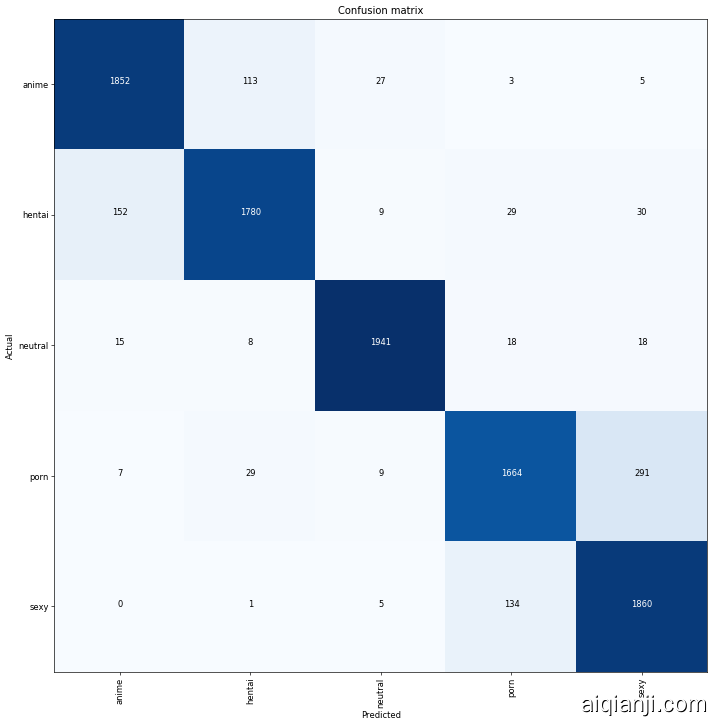 其中对角线表示正确预测的样本数,其它为误分类样本数。这个分类任务至少说明了 5 类别是有区分度的,不论我们用于正常内容与敏感内容的二分类,还是使用 GAN 做一些新奇的模型,类别都是很有区分度的特征。