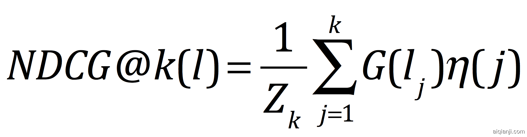 累加部分为DCG(Discounted Cumulative Gain)表示按照位置折损的收益,对于Query下的结果列表l,函数G表示对应Doc的相关度分值,通常取指数函数,即G(lj)=2lj-1(lj表示的是相关度水平,如{0,1,2});函数 η 即位置折损,一般采用 η(j)=1/log(j+1),Doc与Query的相关度越高且位置越靠前则DCG值会越大。另外,通常我们仅关注排序列表页前k位的效果,Zk 表示 DCG@k 的可能最大值,以此进行归一化处理后得到的就是NDCG@k。