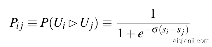 要了解Lambda梯度需要引入LambdaRank。LambdaRank模型是通过Pairwise来构造的,通常将同Query下有点击样本和无点击样本构造成一个样本Pair。模型的基本假设如下式所示,令Pij为同一个Query下Doci相比Docj更相关的概率,其中si和sj分别为Doci和Docj的模型得分: