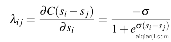 在构造样本Pair时,我们可以始终令i为更相关的文档,此时始终有Sij≡1,代入上式并进行求导,则损失函数的梯度为:
