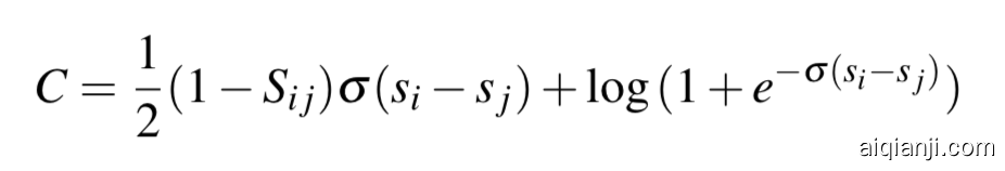 使用交叉熵为损失函数,令Sij表示样本Pair的真实标记,当Doci比Docj更相关时(即Doci有被用户点击,而Docj没有被点击),有Sij=1,否则为-1;则损失函数可以表示为: