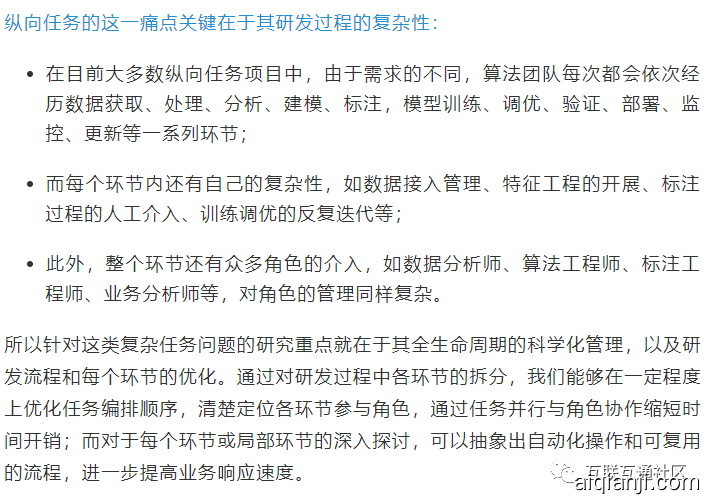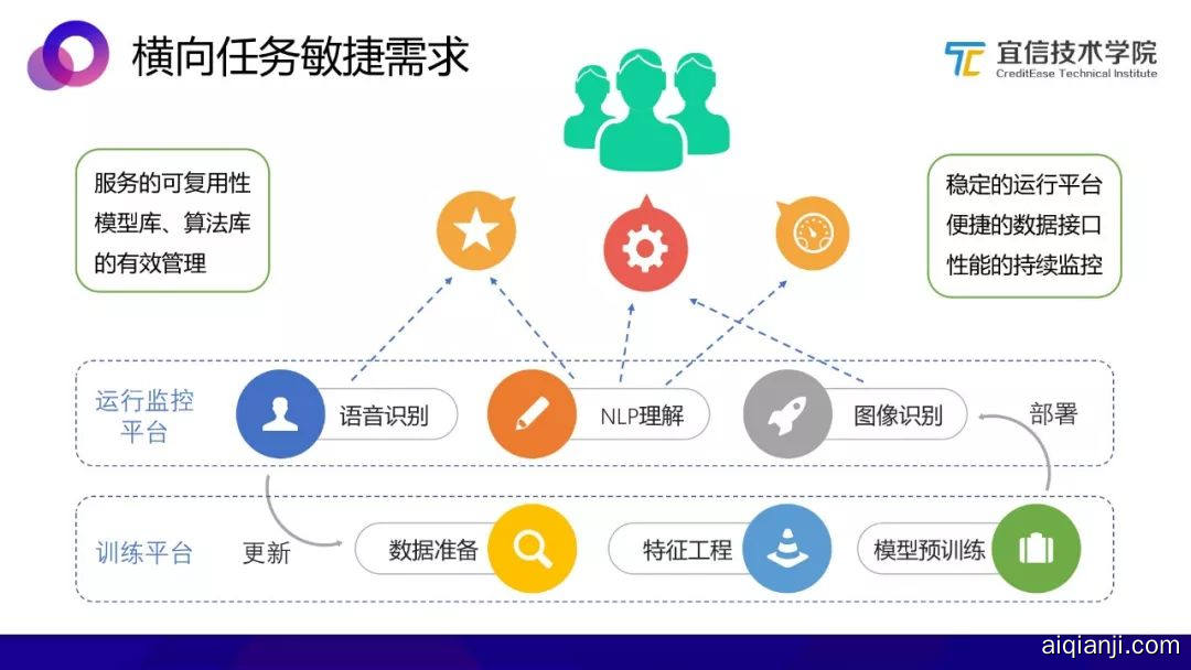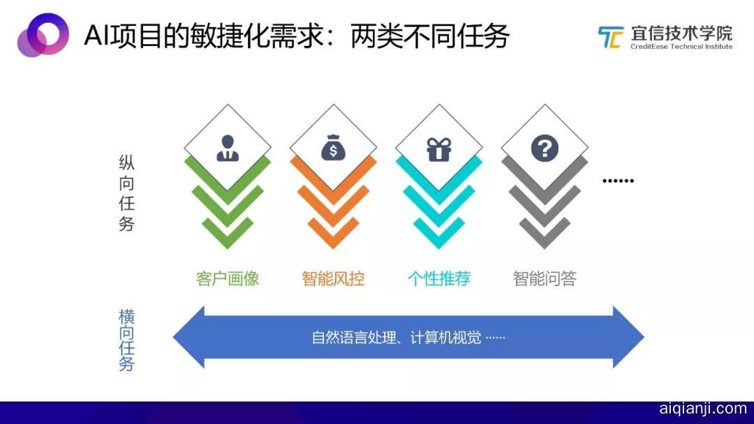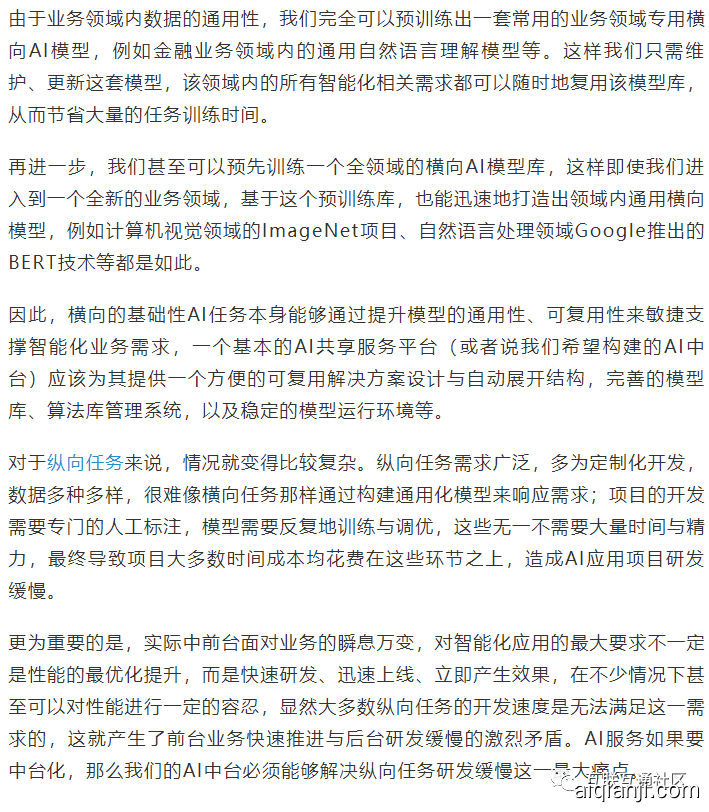 无论是哪方面的需求,都会碰到一个问题:智能业务需求各种各样、各不相同,一个需求下来,研发团队需要针对性开展数据分析处理、模型的构建训练等,过程复杂繁复,效率不高,从而拖长了需求响应时间,降低了业务敏捷程度,拉高了试错成本。这与在中台战略背景下,业务前台希望能够专注于业务逻辑、灵活应对变化产生了矛盾,而且随着智能化应用的广泛开展,这个矛盾也越来越普遍。