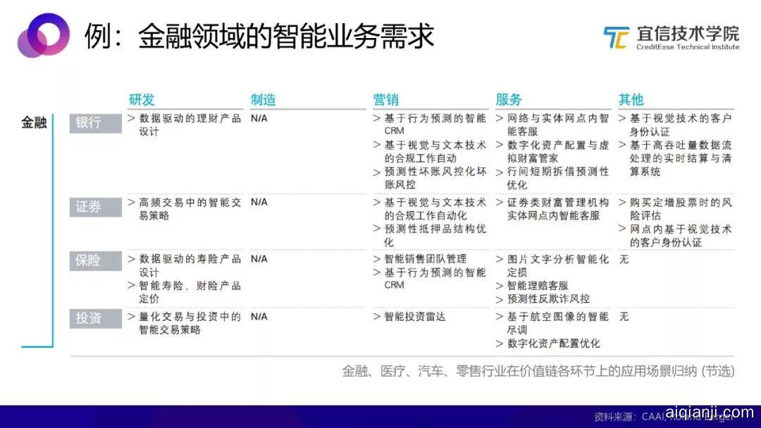 从图中可以看到在金融这一个领域之内就有这么多环节已经形成了标准化的智能应用,可想而知在今天企业业务的发展过程中智能化正在扮演一个多么重要的角色。