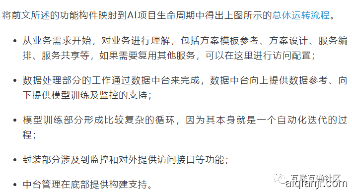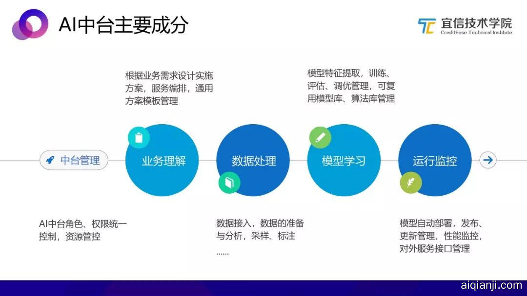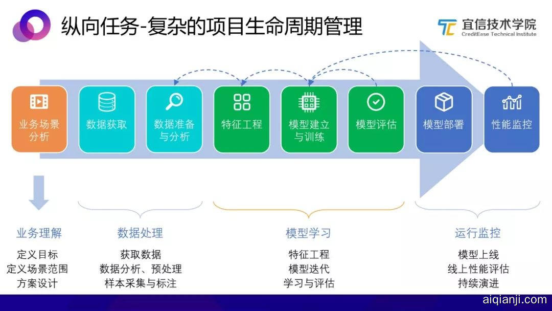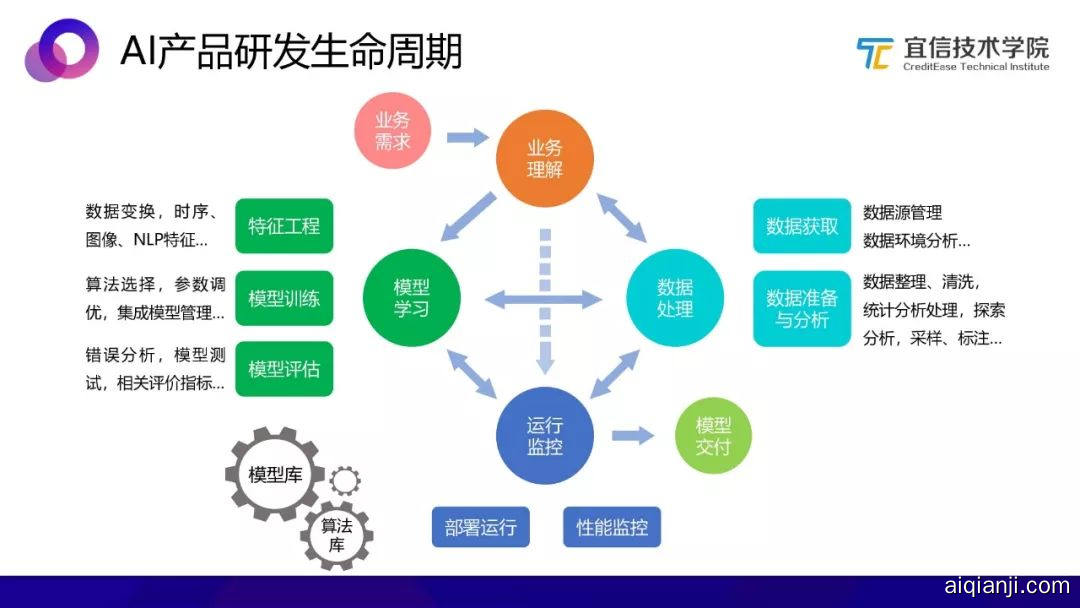 上图展示的是AI产品研发的生命周期,业务需求进来,要经过业务理解、模型学习、数据处理和运行监控四个大的步骤。