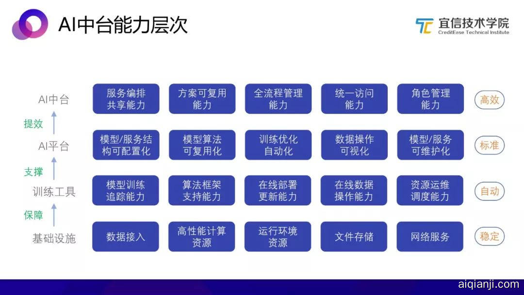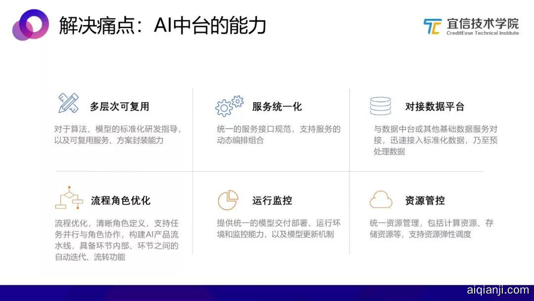 AI中台是一套完整的智能模型全生命周期管理平台和服务配置体系,基于数据平台服务,通过对智能服务的共享复用、对智能服务研发相关角色进行管理,以及研发流程的标准化、自动化,对前台业务提供个性化智能服务的迅速构建能力支持。