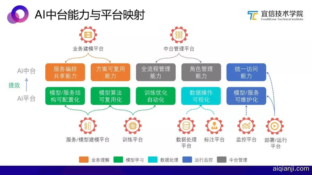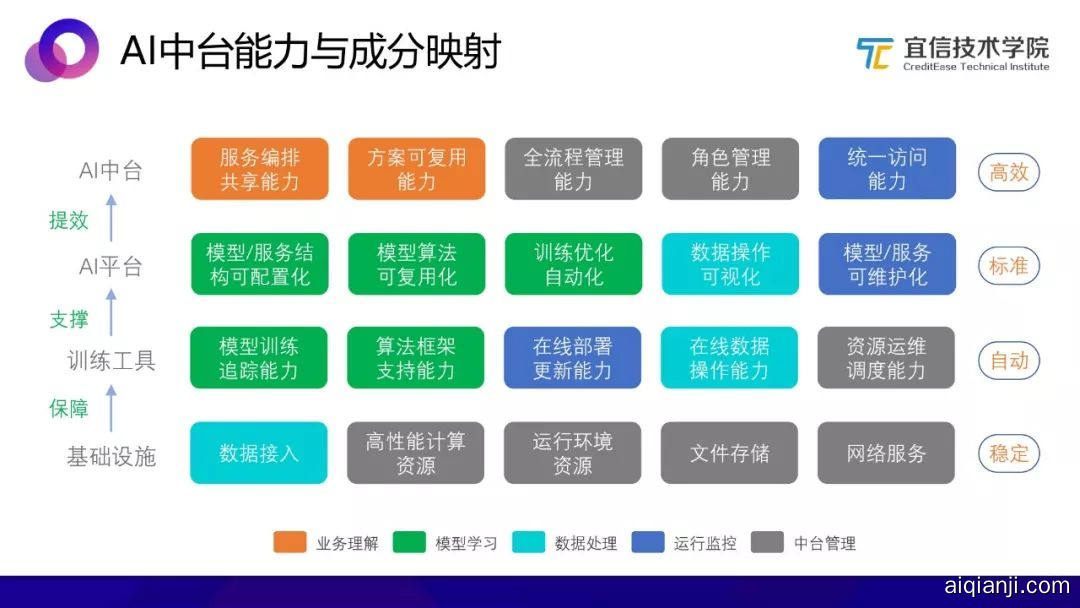 上图将AI中台能力分别与成分、平台进行映射,并且以颜色进行区分与对应。