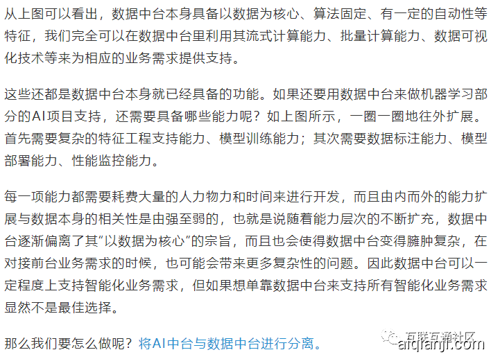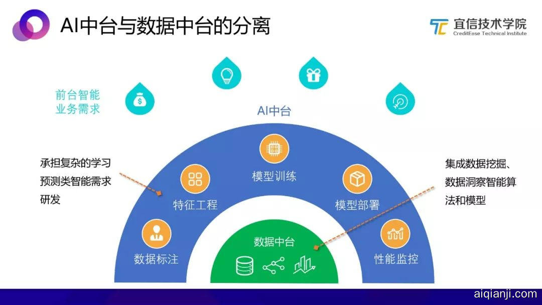 如上图,我们将数据中台外面套着的几层能力抽象剥离出来,整合形成一个独立的中台层,依托数据中台进行一定的协作,共同应对前台的智能化业务需求。数据中台主要集成数据挖掘、数据洞察智能算法和模型;新的中台主要承担复杂的学习预测类智能需求研发。这一中台我们称之为“AI中台”。