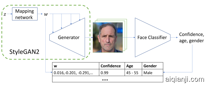 生成随机潜在向量 z1…zn,将它们映射到中间潜在代码 w1个…wn,并用StyleGAN2生成相应的图像样本 G(wi)。