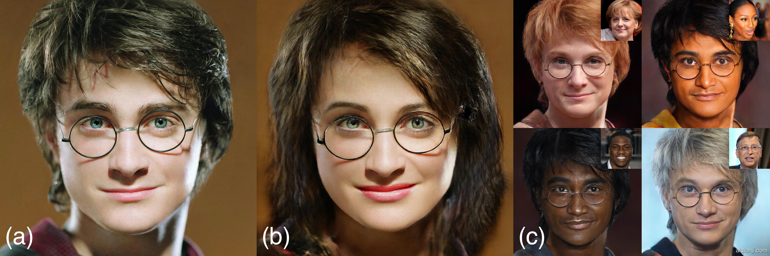 图1:我们的方法从(a)源图像生成的图像处理示例:(b)1024x1024的性别互换和(c)512x512的样式混合。样品产生前馈。