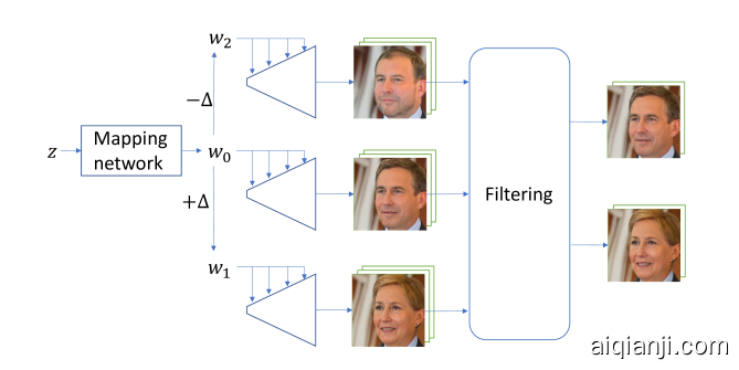 产生随机样本 zi并将它们通过制图网络。对于性别互换任务,创建一组五个图像g(w−Δ),g(w−Δ/2),g(w),g(w+Δ/2),g(w+Δ)