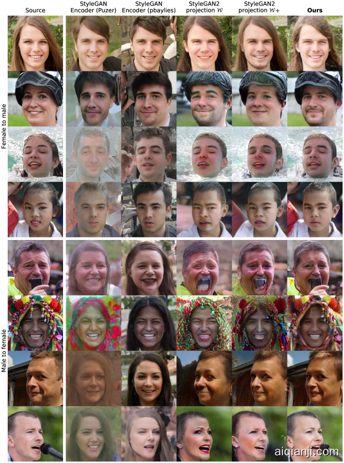 对于每个前馈基线,我们使用FFHQ的20000张图像作为源图像,计算FFHQ数据集的50000张真实图像和20000张生成的图像之间的FID。对于每个源图像,假设源性别由我们的分类模型确定,我们将转换应用于其他性别。在计算FID度量之前,将所有图像调整为256x256大小以进行公平比较。