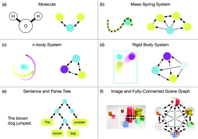 图 2:不同的图形表示。(a) 一个分子,其中每个原子被表示为一个节点,边对应于键(例如 Duvenaud 等,2015)。(b) 质量弹簧系统,其中绳索由一系列质量定义,这些质量在图中表示为节点(例如 Battaglia 等人,2016 年;Chang 等人,2017 年)。(c) 一个n-body 系统,其中主体是节点,底层图是全连接的(例如 Battaglia 等人,2016 年;Chang 等人,2017 年)。(d) 一个刚体系统,其中球和墙是节点,底层图定义了球之间以及球和墙之间的相互作用(例如 Battaglia 等人,2016 年;Chang 等人,2017 年)。(e) 一个句子,其中的单词对应于树中的叶子,其他节点和边可以由解析器提供(例如 Socher 等人,2013 年)。或者,可以使用全连接图(例如 Vaswani 等人,2017 年). (f) 一张图像,可以分解为与全连接图中节点对应的图像块(例如 Santoro 等人,2017 年;Wang 等人,2018c)。虽然标准深度学习工具包包含具有各种形式的关系归纳偏差的方法,但没有“默认”深度学习组件可以在任意关系结构上运行。我们需要具有实体和关系的显式表示的模型,以及找到计算它们的交互的规则的学习算法,以及将它们置于数据中的方法。重要的是,世界上的实体(例如对象和代理)没有自然顺序;相反,排序可以通过它们关系的属性来定义。例如,一组对象的大小之间的关系可以潜在地用于对它们进行排序,它们的质量、年龄、毒性和价格也是如此。