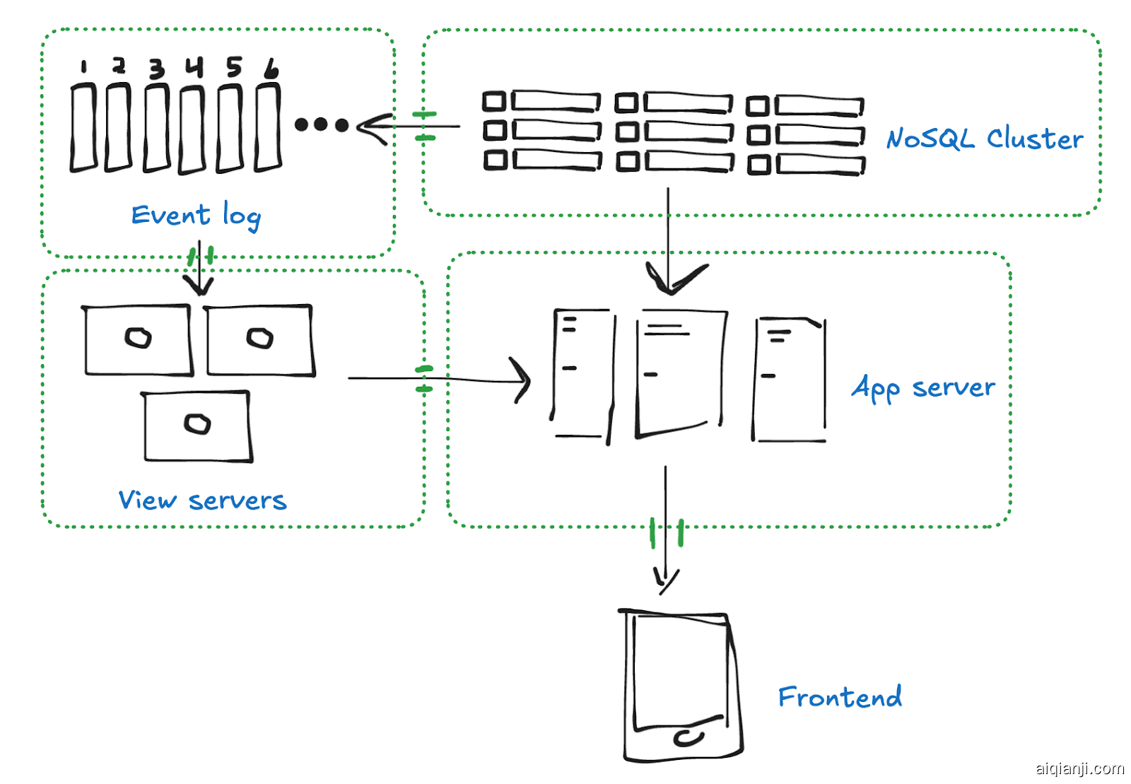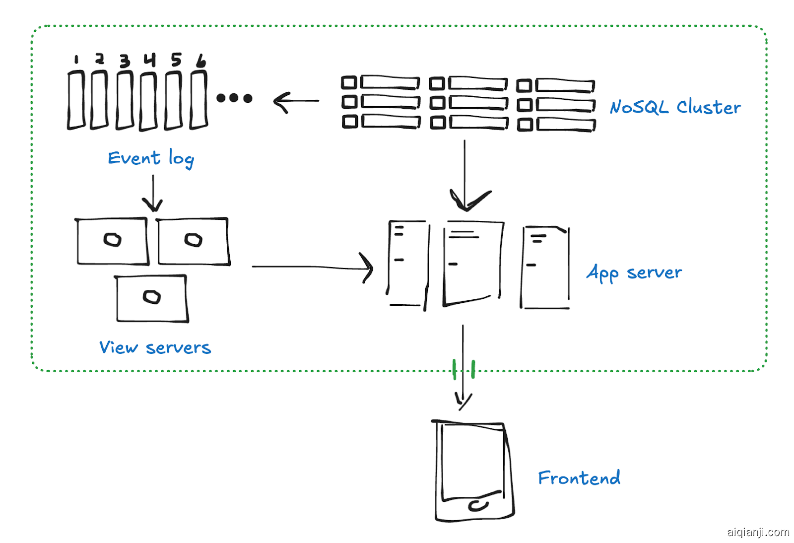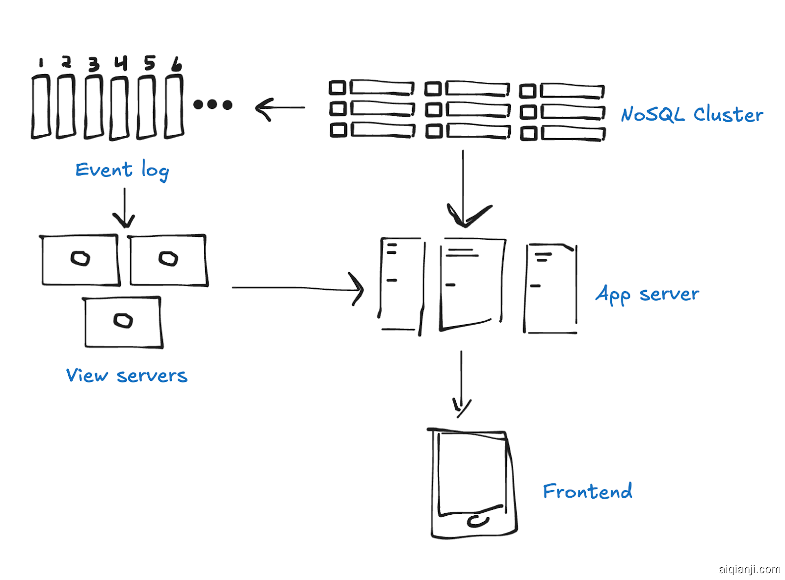 为了解决这个问题,我们引入了一个事件日志(如 Kafka)。这个日志记录并将所有对 NoSQL 集群的变化广播出去。我们的视图服务器监听这个日志——并重播——确保它们不会错过任何更新,即使它们需要重新启动。