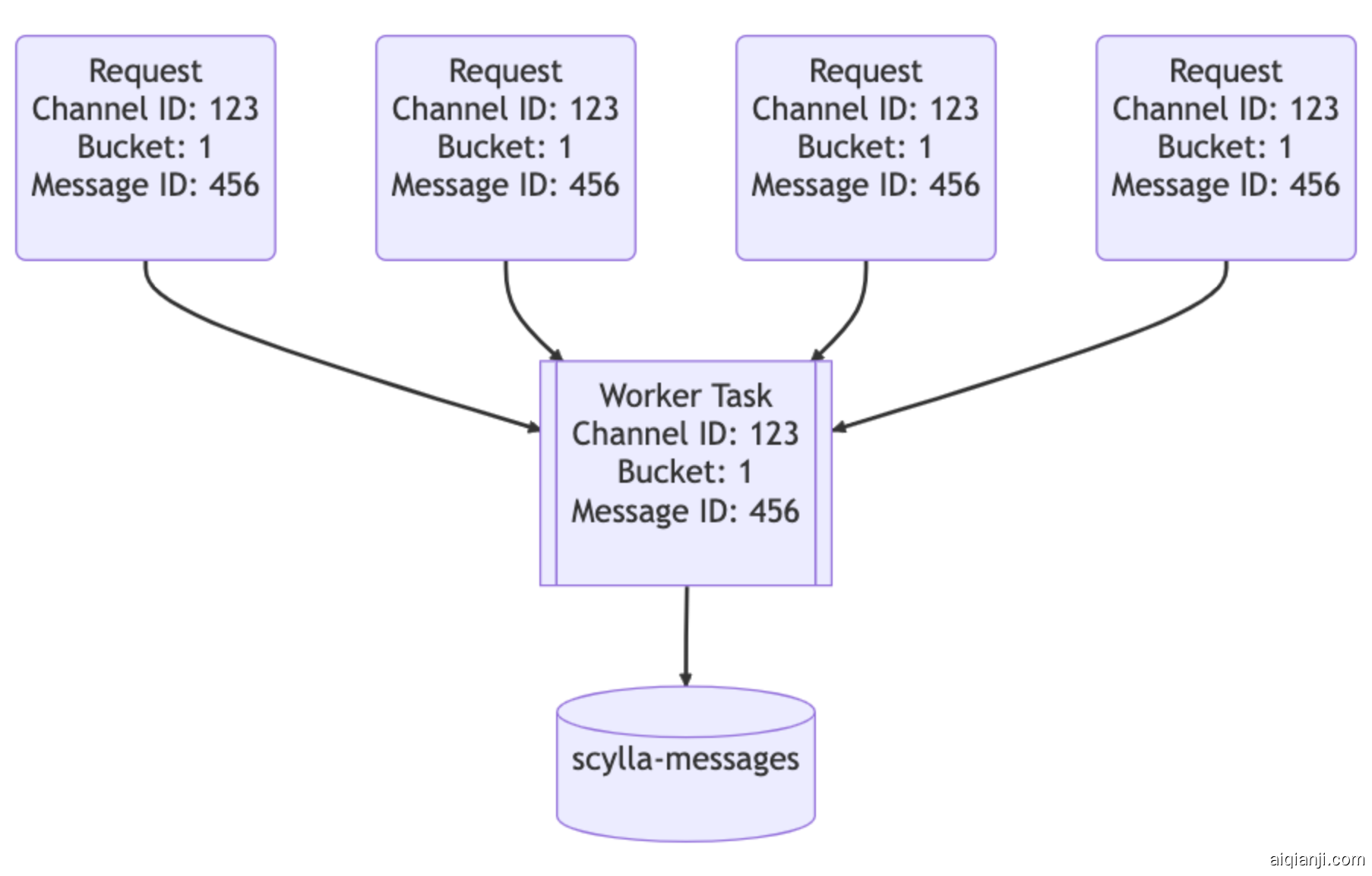 数据服务位于API和ScyllaDB集群之间。它们大约有一个gRPC端点对应一个数据库查询,并且故意没有包含业务逻辑。数据服务提供的最大功能是请求聚合。如果多个用户同时请求相同的行,我们将只查询一次数据库。第一个发出请求的用户将触发服务中一项工作者任务的启动。随后的请求将检查该任务是否存在,并订阅它。那项工作者任务将查询数据库并将行的结果返回给所有订阅者。