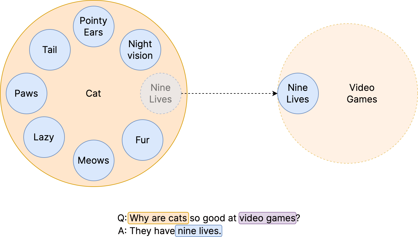 我们的主题是“猫”。列出各个方面并将其中一个方面从上下文中拿出来“九条命”。然后我们寻找“九条命”这一方面所属的其他完全与“猫”无关的模式,并找到了“电子游戏”。