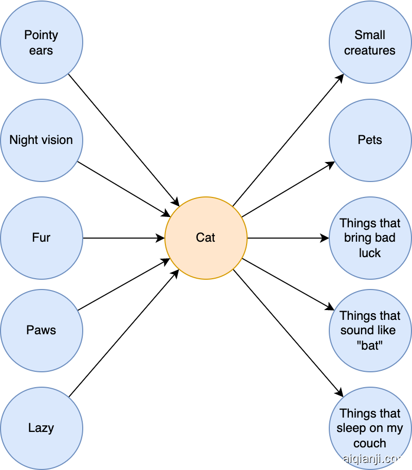 例如,“猫”-“爪子”-“狗”,这是一种有效的关联,但并不有趣或引人入胜,它太显而易见了。“猫”-“九条命”-“电子游戏”则要好得多,因为我们不会把猫和电子游戏联系在一起。
