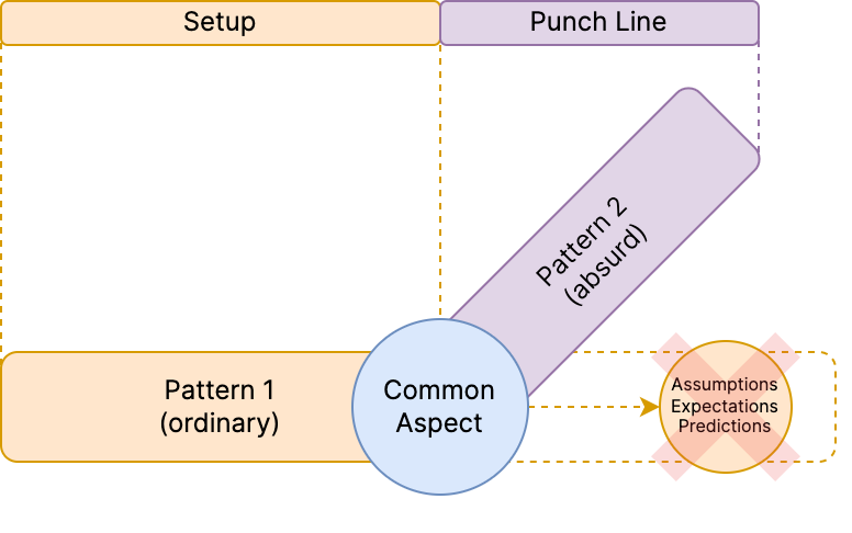 要创作一个笑话,我们需要找到两个彼此有共同点的模式。然后我们可以写出一个铺垫——一句让人们认识到第一个模式的话,以及一个笑点——一句让他们转向第二个模式的话。