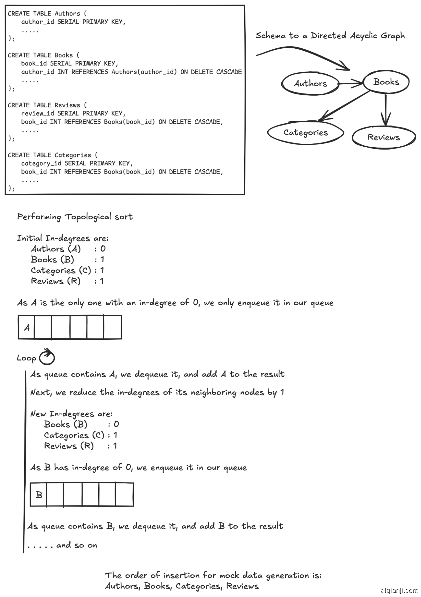 那么,让我们暂时撇开 LLMs 不谈,问一下自己:给出一个 DB 模式,我们如何确保插入顺序总是正确的?或者换句话说,我们如何从 DB 模式中推导出准确的插入顺序?
