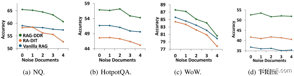 我们对我们对各种大语言模型(LLMs)的实验表明,可微分数据奖励(DDR)在所有基线模型上表现优异,在一系列知识密集型任务中相较于之前的方法(Lin et al., 2023)取得了显著改进。DDR 能够有效改造 LLMs 以进行 RAG 建模,并帮助生成更高质量的合适长度的响应。我们的进一步分析表明,RAG-DDR 模型的有效性主要来源于生成模块,该模块通过 RAG 系统的奖励进行了优化。我们的 DDR 优化生成模块在从检索到的文档中捕捉关键信息和缓解外部知识与参数化内存之间的知识冲突方面更为有效。进一步的分析表明,即使响应生成过程中加入了额外的噪声文档,DDR 优化的 RAG 系统的有效性仍然具有通用性。