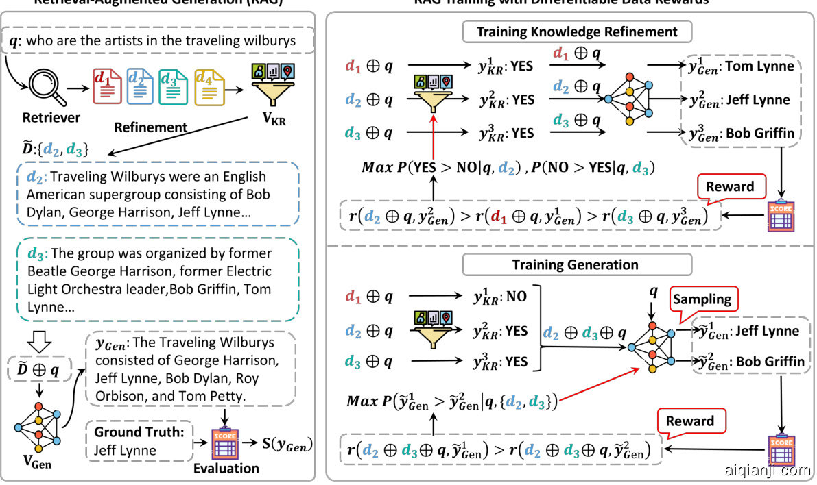 图图 1: 使用我们的可微分数据奖励 (DDR) 方法进行端到端检索增强生成 (RAG) 训练的示意图。在训练过程中,我们迭代优化生成模块 $(V_{\mathrm{Gen}})$ 和知识精炼模块 $(V_{\mathrm{KR}})$。