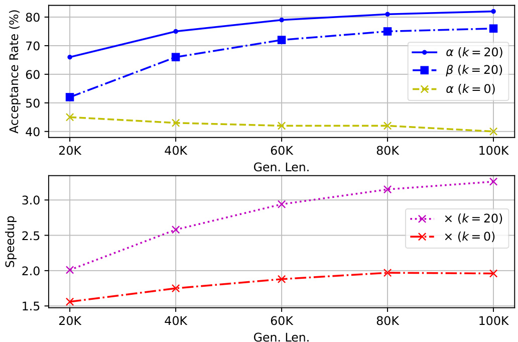 A straightforward solution is to take advantage of recent success in speculative decoding (SD) (Leviathan et al., 2023; Chen et al., 2023), which employs a draft-then-verify strategy to expedite generation while preserving lossless accuracy; see Appendix A and Section 5.1 for detailed background and relevant literature. However, these methods are generally tailored for generating short sequences, e.g., TriForce (Sun et al., 2024a) and MagicDec (Chen et al., 2024a) are limited to generating 256 and 64 tokens, respectively. Directly extending their generation length to 100K tokens would inevitably encounter failures due to KV cache budget constraints. Furthermore, even when applied to optimized KV cache architectures such as Group Query Attention (GQA), these methods yield only marginal acceleration gains for short-sequence generation, as evidenced in Tables 1 and 3. This observation leads to a pivotal research question:
