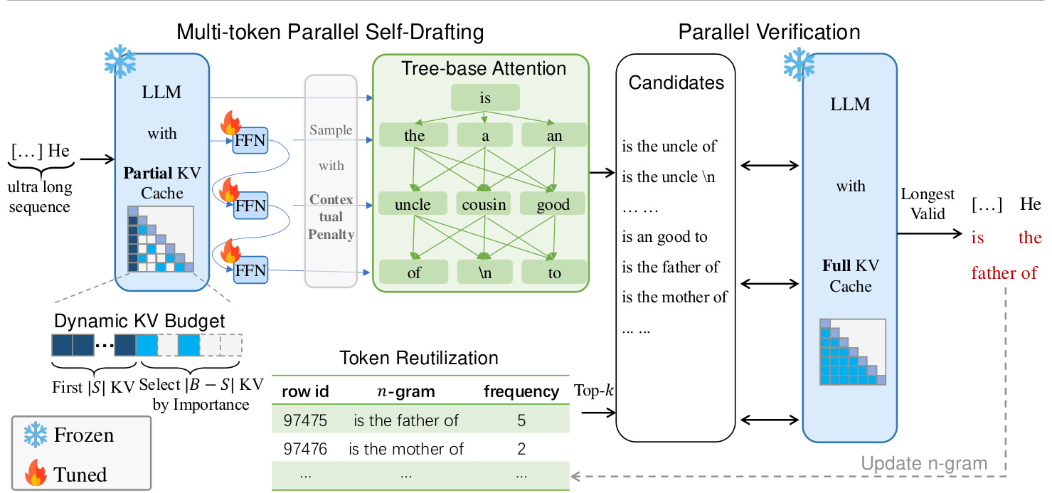 Building on these insights, we introduce our framework TOKENSWIFT, which utilizes $n$ -gram retrieval and dynamic KV cache updates to accelerate ultra-long sequence generation. Specifically, we employ multi-token generation and token re utilization to enable the LLM (i.e. target model) to draft multiple tokens in a single forward pass, alleviating the first challenge of frequent model reloading (§3.2). As the generation progresses, we dynamically update the partial KV cache at each iteration, reducing the KV cache loading time (§3.3). Finally, to mitigate the issue of repetitive outputs, we apply contextual penalty to constrain the generation process, ensuring the diversity of output (§3.4).