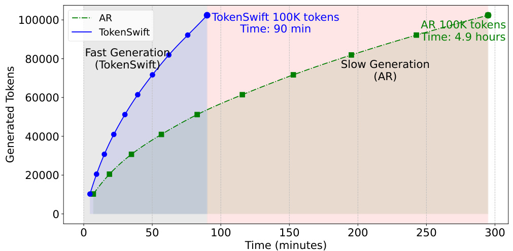 Figure 1. Comparison of the time taken to generate 100K tokens using auto regressive (AR) and TOKENSWIFT with prefix length of 4096 on LLaMA3.1-8b. As seen, TOKENSWIFT accelerates the AR process from nearly 5 hours to just 90 minutes.