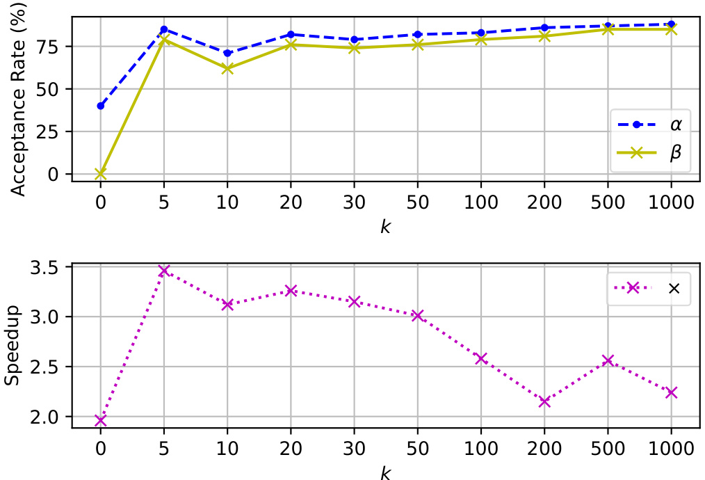 Interestingly, a lower $k$ does not always result in a lower $\beta$ . For instance, $k=5$ achieves a higher $\beta$ than $k=20$ , resulting in both a higher acceptance rate $\alpha$ and greater speedu $_p\times$ . However, at $k=5$ , the lack of diversity among the candidates leads to increased repetition, which in turn degrades the quality of generation.