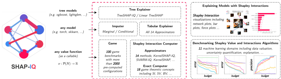 Figure 1: The shapiq Python package facilitates research on game theory for machine learning, including state-of-the-art approximation algorithms and pre-computed benchmarks. Moreover, it provides a simple interface for explaining predictions of machine learning models beyond feature attributions.