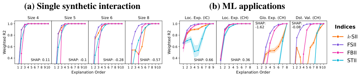 Figure 4: Shapley-weighted  $R^{2}$   of interaction indices by explanation order for (a) single synthetic interactions and (b) ML applications. FSII is optimized for this metric, and increases faithfulness with each order. Interactions improve faithfulness over SHAP and yield an exact decomposition for the highest order. However, increasing interaction size negatively affects faithfulness.