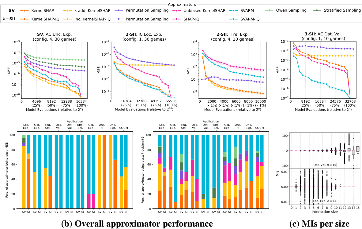 (a) Approximation quality in different application domains Figure 5: Overview of the benchmark results containing (a) budget-dependent MSE approximation curves on different benchmark settings, (b) a summary of the best performing ap proxima tors per setting over all 100 benchmark games measured by MSE (left) and Precision  $\ @5$   (right), and (c) exemplary MIs for ten games of Data Valuation (top) and Local Explanation (bottom).