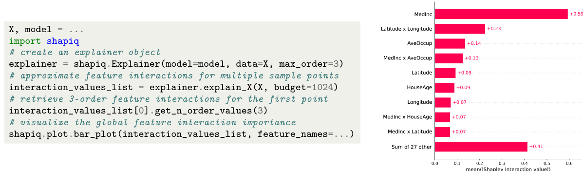 图 3: 左:使用 shapiq 全局解释多个模型预测的示例代码。右:全局特征交互重要性以条形图形式可视化。