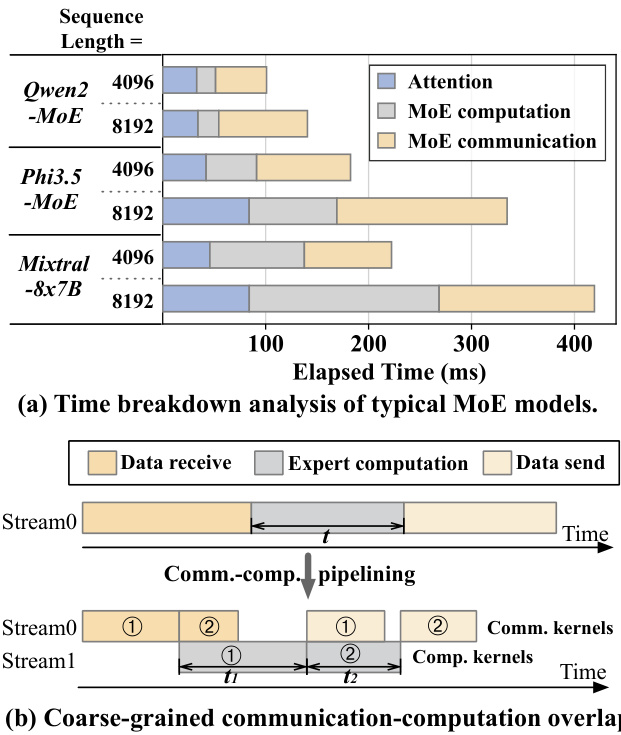Figure 1 Analysis of the execution of MoE. (a) Time breakdown of MoE models executed on 8 H800 GPUs using Megatron-LM. (b) An illustration of communicationcomputation overlap by partitioning an expert computation kernel into two.