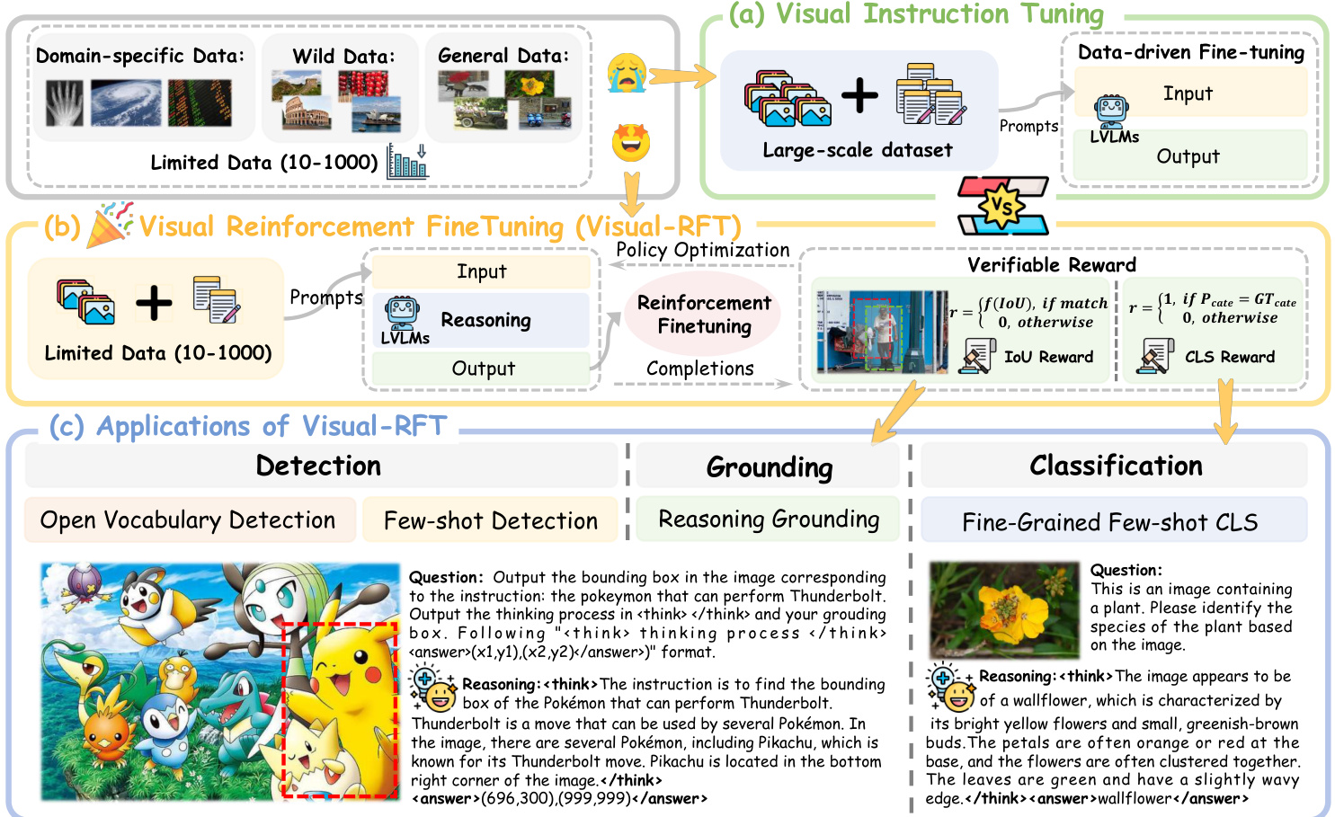 Figure 2. Overview of Visual-RFT. Compared to the (a) Visual Instruction Tuning that is data-hungry, (b) our Visual Reinforcement Fine-Tuning (Visual-RFT) is more data efficient with limited data. (c) We successfully empower Large Vision-Language Models (LVLMs) with RFT on a series of multi-modal tasks, and present examples of the model's reasoning process at the bottom.