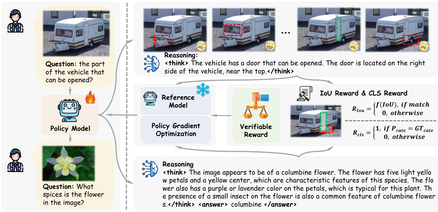 Figure 3. Framework of Visual-RFT. Given the question and visual image inputs,the policy model generates multiple responses containing reasoning steps. Then the verifiable reward such as IoU reward and CLS reward is used with the policy gradient optimization algorithm to update the policy model.