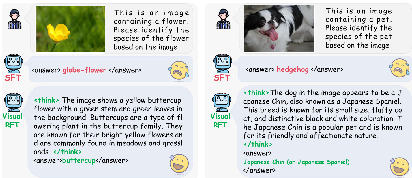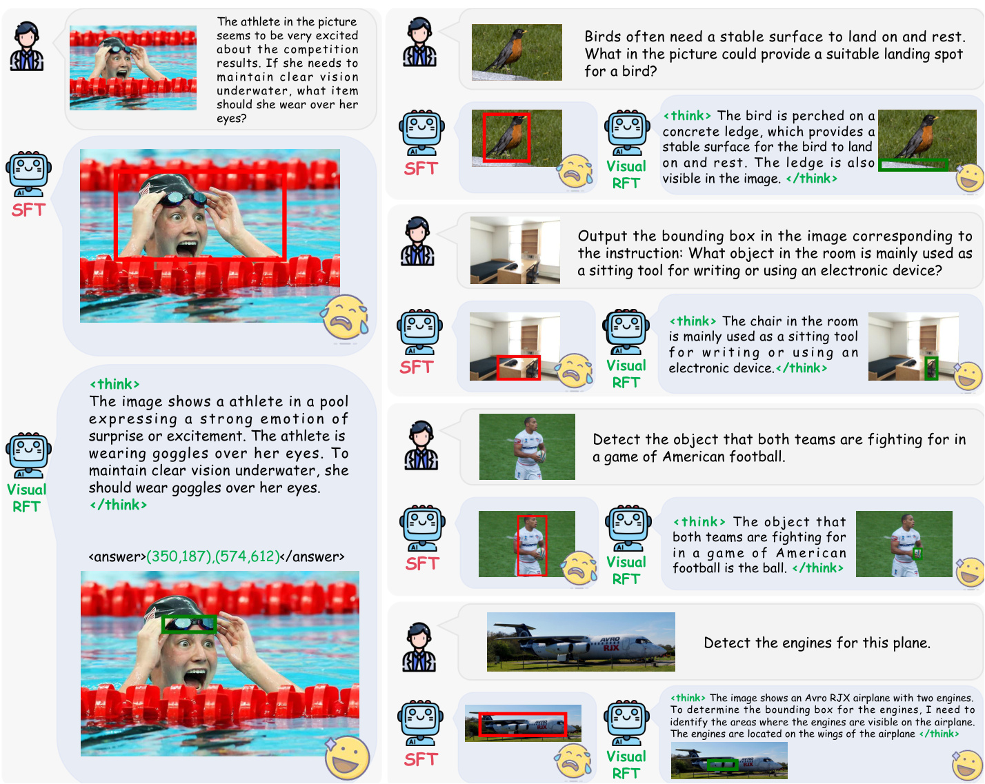 SFT 范式 (见图 2 (a)) 直接模仿高质量、精选数据中提供的“真实”答案,因此依赖于大量的训练数据。相比之下,RFT 评估模型的响应并根据其是否正确进行调整,帮助其通过试错学习。因此,RFT 在数据稀缺的领域特别有用 [7, 24]。然而,之前的普遍认知是 RFT 仅适用于科学 (如数学) 和代码生成等任务。这是因为数学和编码具有明确且客观的最终答案或测试用例,使得其奖励相对容易验证。在本文中,我们展示了 RFT 可以应用于数学和代码领域之外的视觉感知任务。具体来说,我们引入了视觉强化微调 (Visual-RFT),成功地将 RFT 扩展到赋能大视觉语言模型 (LVLMs) 在各种多模态任务中 (见图 1),例如少样本分类和开放词汇对象检测。